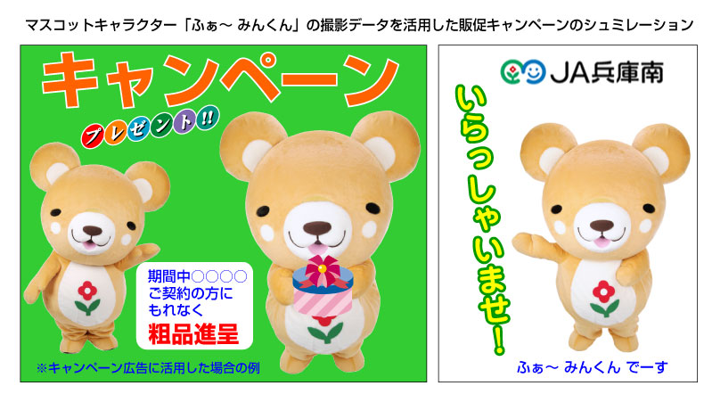 | <ホームページ・広報・広告宣伝材料用などの撮影例 マスコットキャラクター編> JA兵庫南のマスコットキャラクター「ふぁーみんくん」の撮影例をご覧ください。 人気の「ゆるキャラ」マスコットキャラクターJA兵庫南様の「ふぁーみんくん」を撮影させていただきました。 今後ホームページ・パンフレットやチラシ、各種キャンペーンなどに登場し活躍してくれることと思います。 もちろんスタジオで多種多様のポーズを多数カット撮影し、モニターで選んでいただいて余分な背景などを切り抜き処理しデータを作成させていただきました。 |